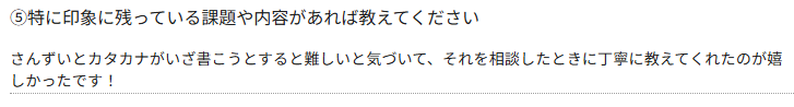 「さんずいとカタカナがいざ書こうとすると難しいと気づいて、それを相談したときに丁寧に教えてくれたのが嬉しかったです!」