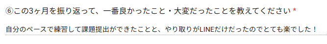 「自分のペースで練習して課題提出ができたことと、やり取りがLINEだけだったのでとても楽でした!」