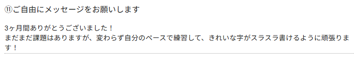 「3ヶ月間ありがとうございました! まだまだ課題はありますが、変わらず自分のペースで練習して、きれいな字がスラスラ書けるように頑張ります!」