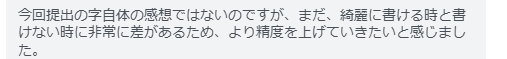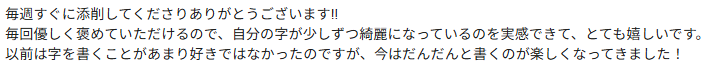 「毎週すぐに添削してくださりありがとうございます‼︎ 毎回優しく褒めていただけるので、自分の字が少しずつ綺麗になっているのを実感できて、とても嬉しいです。 以前は字を書くことがあまり好きではなかったのですが、今はだんだんと書くのが楽しくなってきました!」
